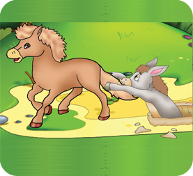 Arxasını çevirib arxa ayaqları ilə Eşşəyi elə vurdu ki, Eşşək yumbalanıb təzədən quyuya düşdü. Nə qədər qışqırdısa da, At ona məhəl qoymayıb yoluna davam elədi.